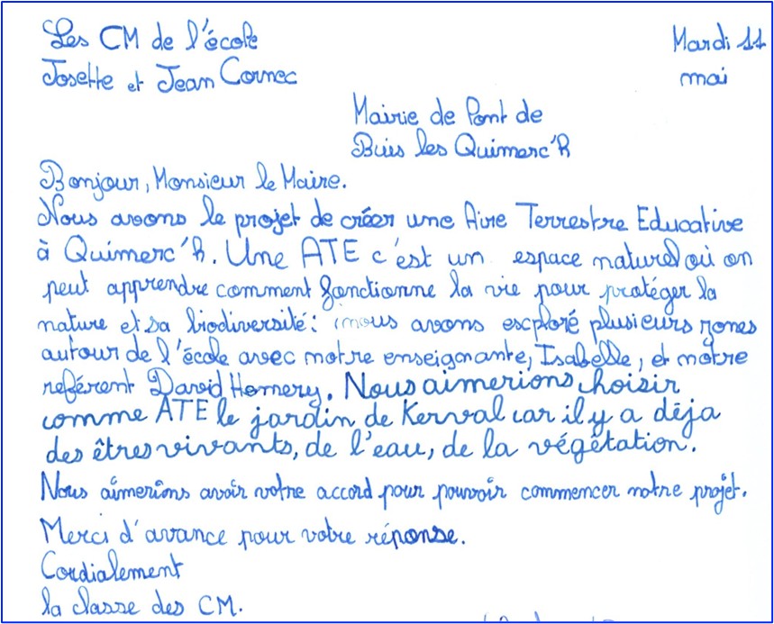 Après avoir réalisé de nombreux inventaires naturalistes sur leur Aire, les élèves ont pu imaginer une nouvelle gestion du site : des zones avec une intervention réduite pour favoriser la biodiversité et des zones à entretenir pour en permettre l’accès. Les élèves ont également repéré des espèces invasives qui concurrencent la végétation locale. Ils décident alors d’envoyer une lettre au maire pour proposer un plan de gestion du site, jusqu’alors entretenu sporadiquement par un chantier de réinsertion financé par la mairie. À la suite de cette demande, le chef de chantier de réinsertion et le maire de Pont-de-Buis lès Quimerc’h sont allés en classe, afin d’échanger avec les élèves et ont également visité l’ATE en leur compagnie, afin bien comprendre leurs attentes. Depuis, une co-gestion du site, financée par la mairie, s’est mise en place.
