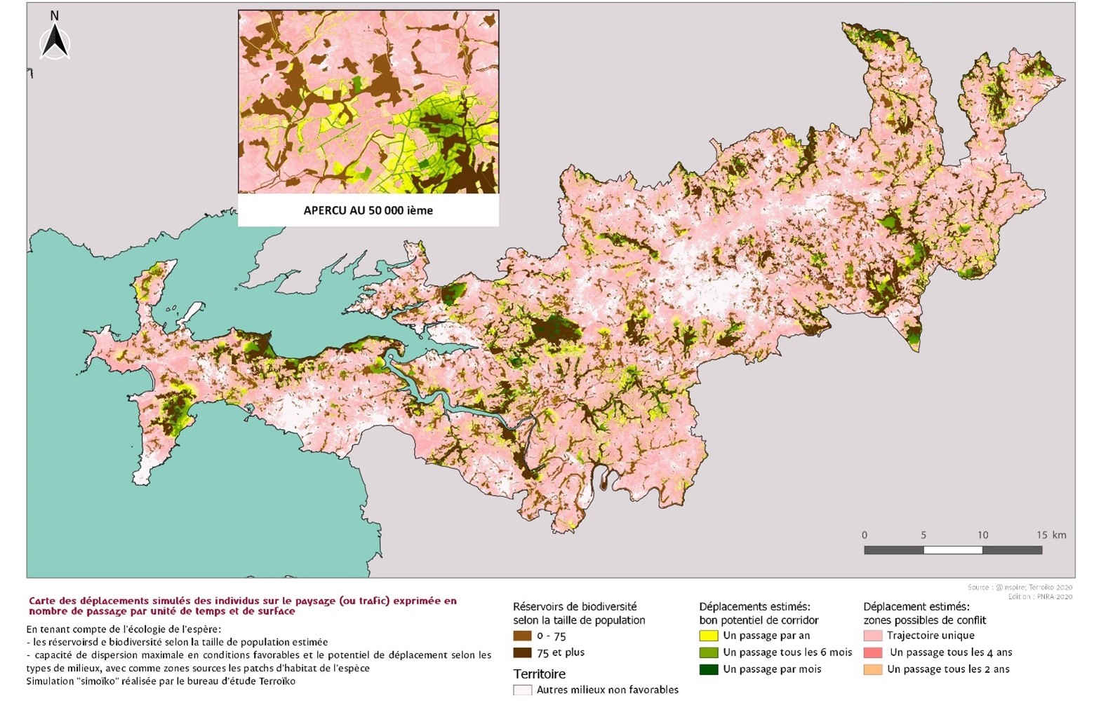 − les corridors écologiques potentiels correspondent aux espaces proches de ces réservoirs de biodiversité, plus ou moins constitués de milieux boisés, dans un rayon de 50 m.Pour affiner cette approche, une analyse de la perméabilité des milieux a été réalisée avec le simulateur ®SimOïko pour une espèce indicatrice des milieux boisés, à savoir l’écureuil roux, et en utilisant la cartographie des grands types de végétation produite par le CBNB.
